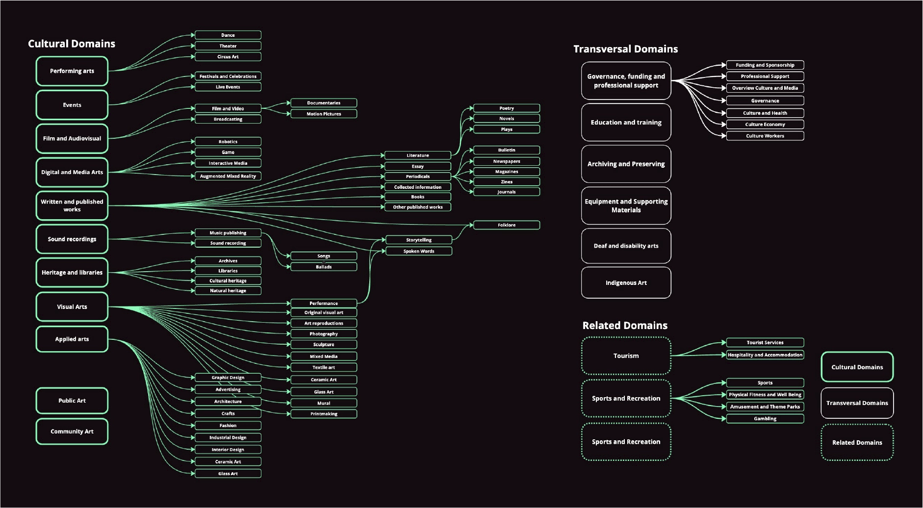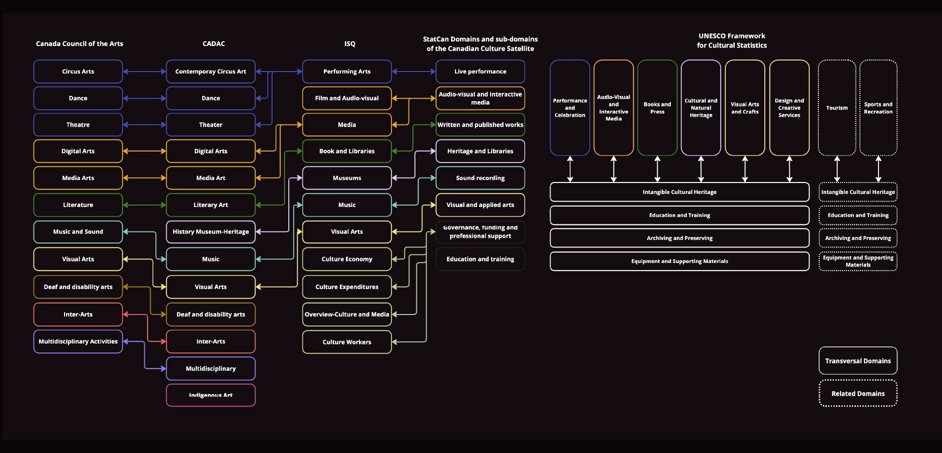 We aligned with established Canadian cultural taxonomies to ensure interoperability with funders and data-producing institutions. However, we introduced a thematic layer to accommodate emerging or cross-disciplinary practices. This balanced structural consistency with adaptability.