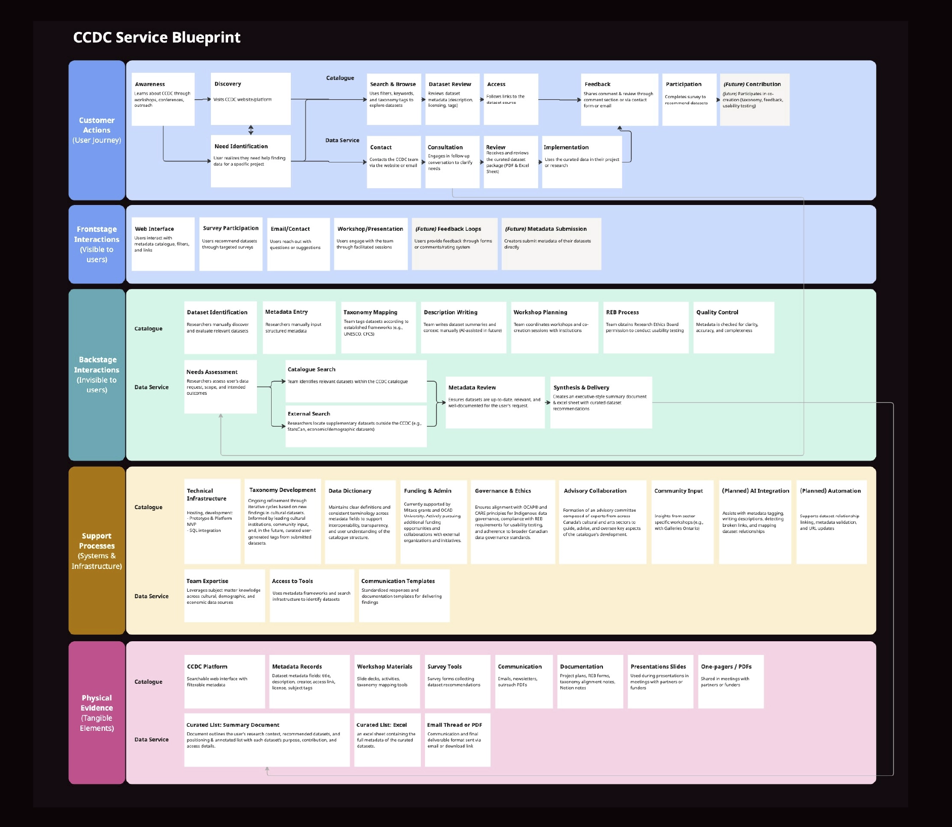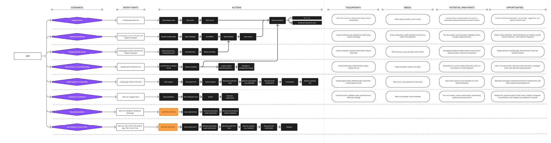 Personas were developed from stakeholder research to reflect varying levels of data literacy and discovery intent. The service blueprint mapped: