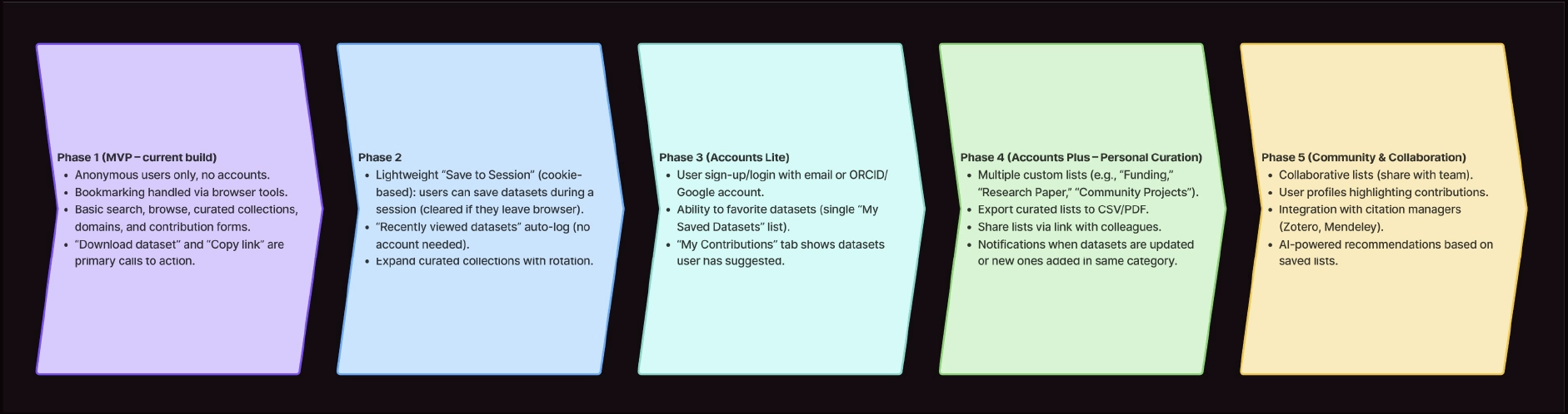 Advanced capabilities, such as user accounts and expanded contribution workflows, were intentionally deferred. For launch, we prioritized a stable, high-performing search system and validated dataset entries over feature breadth.