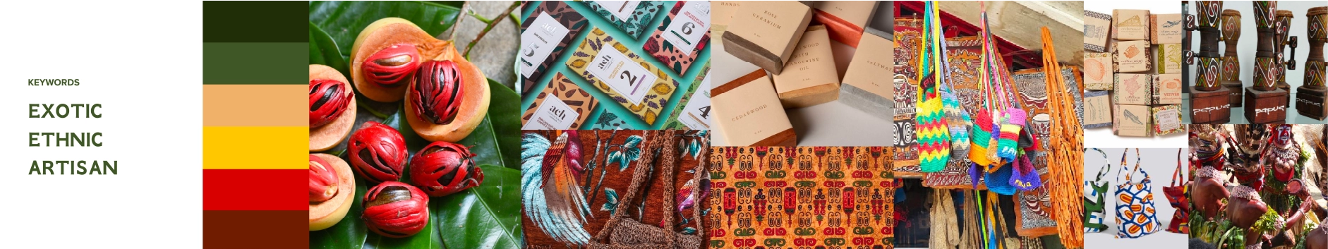 Benchmark references were drawn from brands that emphasize handcrafted authenticity, alongside those that employ bold color palettes and memorable visual systems. The intent was to create a brand that stands out visually while remaining honest to its roots as a handmade product from a small Papuan village.
